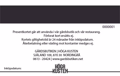 Presentkort 200kr 200.00 SEK Köp presentkort till Gårdsbutiken i Höga KustenDetta presentkort kan användas under sommarsäsong i vår butik och restaurang.Giltigt 24 månader från inköpsdatum. I lager. Lägg i korgen Dela Artikelnummer: 65 Information Recensioner Köp presentkort till Gårdsbutiken i Höga KustenDetta presentkort kan användas under sommarsäsong i vår butik och restaurang.Giltigt 24 månader från inköpsdatum.